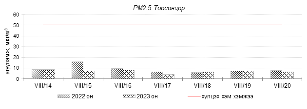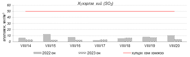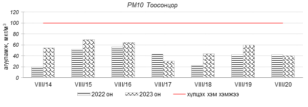 Улаанбаатар хотын агаарын чанар 2023 оны 08 дугаар сарын 14-20-нд Толгойт, Нисэх, Зурагт, Зайсан, Хайлааст, 5-н буудал, Шархад, Налайх, 1-р хороолол, 13-р хороолол, Мишээл экспо, Ургах наран хороолол, Амгалан, Цахилгаан станц, Баянхошуу орчим “Цэвэр” болон “Хэвийн”, харин зарим өдрүүдэд 100-н айл, Баруун 4-н зам орчим “Бага бохирдолтой” түвшинд хүрсэн байна. Дэлгэрэнгүйг эндээс үзнэ үү.