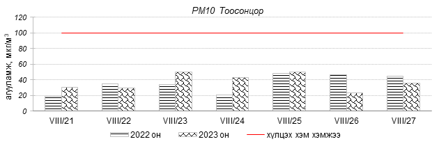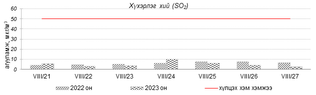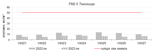 Улаанбаатар хотын агаарын чанар 2023 оны 08 дугаар сарын 21-27-нд Толгойт, Нисэх, Зурагт, Зайсан, Хайлааст, 5-н буудал, Шархад, Налайх, 1-р хороолол, 13-р хороолол, Мишээл экспо, Ургах наран хороолол, Амгалан, Цахилгаан станц, 100-н айл орчим “Цэвэр” болон “Хэвийн”, харин зарим өдрүүдэд Баруун 4-н зам орчим “Бага бохирдолтой” түвшинд хүрсэн байна. Дэлгэрэнгүйг эндээс үзнэ үү.