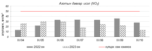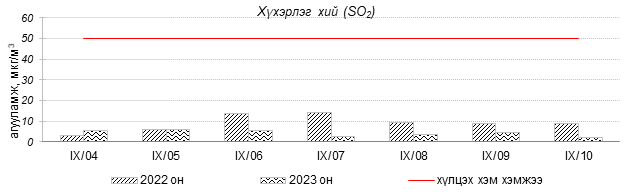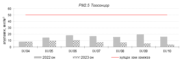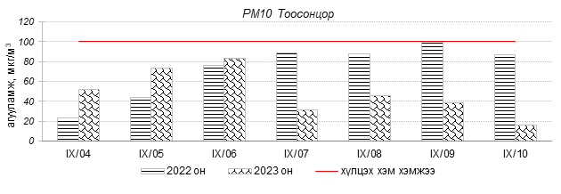 Улаанбаатар хотын агаарын чанар 2023 оны 09 дүгээр сарын 04-10-нд Толгойт, Нисэх, Зурагт, Зайсан, Хайлааст, 5-н буудал, Шархад, Налайх, 1-р хороолол, 13-р хороолол, Мишээл экспо, Ургах наран хороолол, 100-н айл, Амгалан орчим “Цэвэр” болон “Хэвийн”, харин Баруун 4-н зам, Цахилгаан станц орчим ихэнхдээ “Бага бохирдолтой” түвшинд байсан байна. Дэлгэрэнгүйг эндээс үзнэ үү.