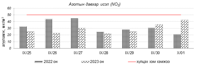 Улаанбаатар хотын агаарын чанар 2023 оны 09 дүгээр сарын 25-аас 10 дугаар сарын 01-нд 100-н айл, Толгойт, Нисэх, Зурагт, Зайсан, Хайлааст, 5-н буудал, Шархад, Налайх, 13-р хороолол, Мишээл экспо, Ургах наран хороолол, Амгалан, Баянхошуу орчим “Цэвэр” болон “Хэвийн”, зарим өдрүүдэд Цахилгаан станц, 1-р хороолол, Баруун 4-н зам орчим “Бага бохирдолтой” түвшинд байсан байна. Дэлгэрэнгүйг эндээс үзнэ үү.
