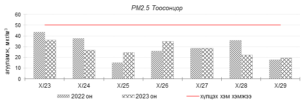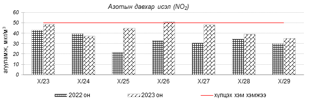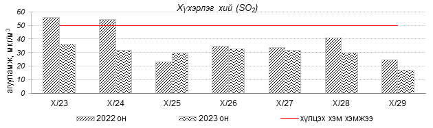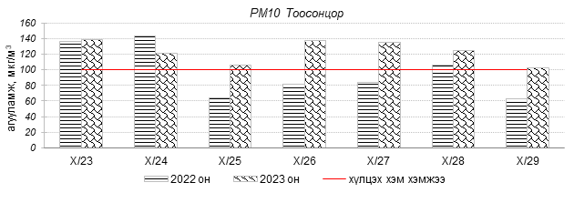 Улаанбаатар хотын агаарын чанар 2023 оны 10 дугаар сарын 23-29-нд Шархад, Зайсан орчим “Хэвийн”, харин Толгойт, Нисэх, Зурагт, Налайх, Хайлааст, 5-н буудал, Мишээл экспо, 13-р хороолол, Амгалан, Ургах наран хороолол, 1-р хороолол, 100-н айл, Баруун 4-н зам орчим “Бага бохирдолтой”, Баянхошуу, Цахилгаан станц орчим “Бохирдолтой” түвшинд хүрсэн байна. Дэлгэрэнгүйг эндээс үзнэ үү.