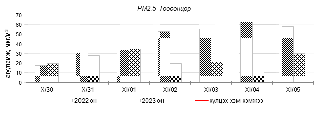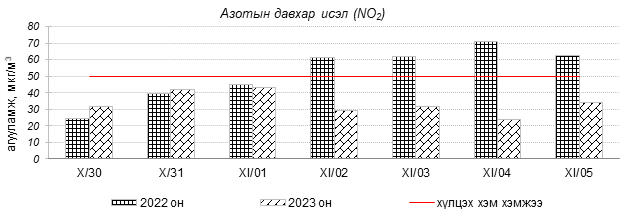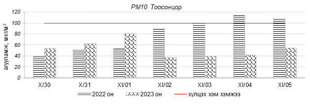 Улаанбаатар хотын агаарын чанар 2023 оны 10 дугаар сарын 30-аас 11 дүгээр сарын 05-нд 100-н айл, Цахилгаан станц, Шархад, Зайсан, Толгойт, Нисэх, Налайх, Мишээл экспо, 13-р хороолол, Амгалан, Ургах наран хороолол орчим “Цэвэр” болон “Хэвийн”, харин зарим өдөр Хайлааст, 5-н буудал, 1-р хороолол, Зурагт, Баянхошуу, Баруун 4-н зам орчим “Бага бохирдолтой” түвшинд хүрсэн байна. Дэлгэрэнгүйг эндээс үзнэ үү.