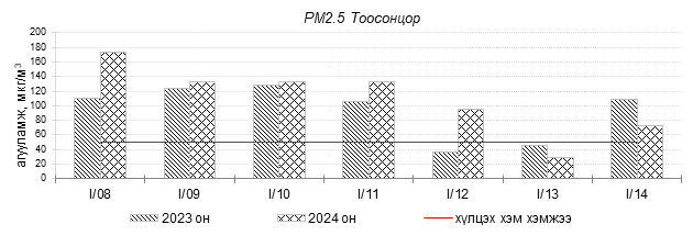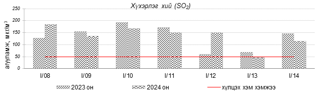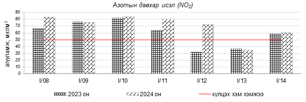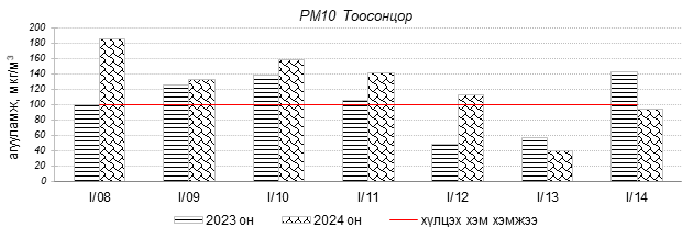 Улаанбаатар хотын агаарын чанарын индексийн мэдээгээр 2024 оны 01 дүгээр сарын 08-14-ний өдрүүдэд Толгойт, Нисэх, 13-р хороолол, Амгалан, Ургах наран хороолол, Зайсан, Мишээл экспо, Налайх, Цахилгаан станц орчим “Бага бохирдолтой”, 100-н айл, Баруун 4-н зам, Зурагт 5-н буудал орчим “Бохирдолтой”, 1-р хороолол, Шархад, Хайлааст орчим “Их бохирдолтой”, Баянхошуу орчим “Маш их бохирдолтой” түвшинд хүрсэн байна. Дэлгэрэнгүйг эндээс үзнэ үү.
