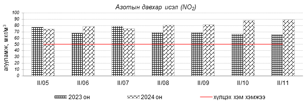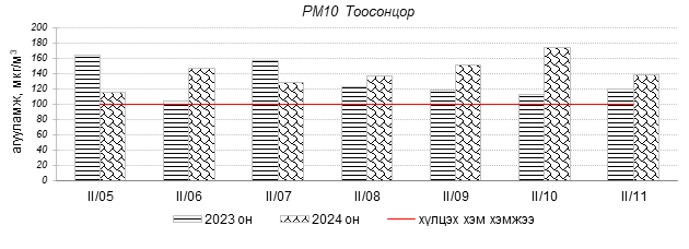 Улаанбаатар хотын агаарын чанарын индексийн мэдээгээр 2024 оны 02 дугаар сарын 05-11-ний өдрүүдэд Зайсан, Толгойт, Нисэх, 13-р хороолол, Баруун 4-н зам, Налайх, 100-н айл, Амгалан, 5-н буудал, Ургах наран хороолол, Мишээл экспо, Цахилгаан станц орчим “Бага бохирдолтой”, Зурагт, 1-р хороолол, Дамбадаржаа, Шархад орчим “Бохирдолтой”, Хайлааст орчим “Их бохирдолтой”, Баянхошуу орчим “Маш их бохирдолтой” түвшинд хүрсэн байна. Дэлгэрэнгүйг эндээс үзнэ үү.