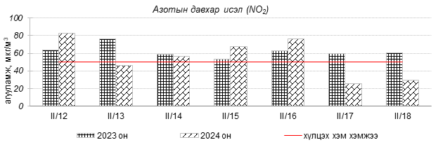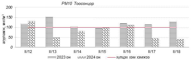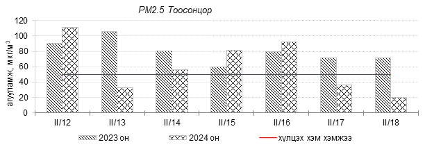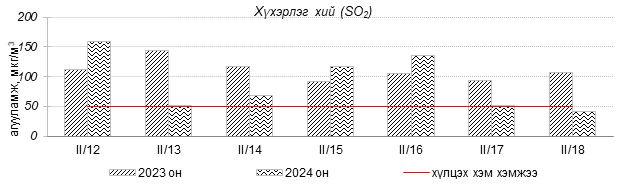 Улаанбаатар хотын агаарын чанарын индексийн мэдээгээр 2024 оны 02 дугаар сарын 12-18-ны өдрүүдэд Зайсан, Толгойт, Нисэх, 13-р хороолол, Баруун 4-н зам, Зурагт, Налайх, 100-н айл, Дамбадаржаа, Шархад, Амгалан, 5-н буудал, Ургах наран хороолол, Мишээл экспо, Цахилгаан станц орчим “Бага бохирдолтой”, 1-р хороолол, Баянхошуу, Хайлааст орчим “Бохирдолтой”, Баянхошуу орчим “Их бохирдолтой” түвшинд хүрсэн байна. Дэлгэрэнгүйг доорх хавсралтаас үзнэ үү.