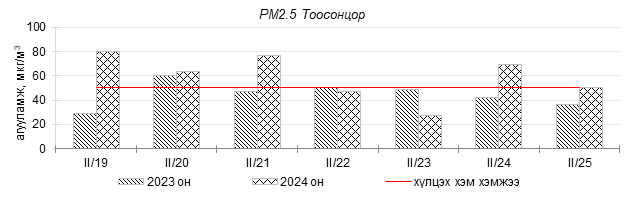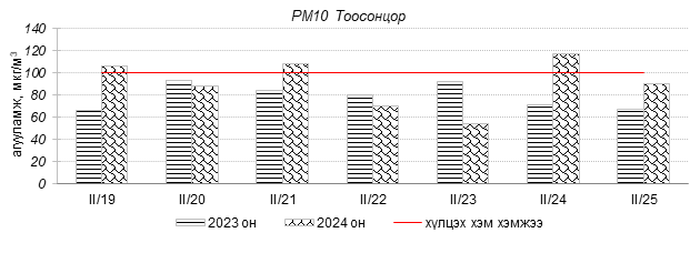 Улаанбаатар хотын агаарын чанарын индексийн мэдээгээр 2024 оны 02 дугаар сарын 19-25-ны өдрүүдэд Зайсан, Толгойт, Нисэх, 13-р хороолол, Баруун 4-н зам, Налайх, 1-р хороолол, 100-н айл, Дамбадаржаа, Шархад, Амгалан, 5-н буудал, Ургах наран хороолол, Мишээл экспо, Цахилгаан станц орчим “Бага бохирдолтой”, Баянхошуу, Зурагт, Хайлааст орчим “Бохирдолтой” түвшинд байсан байна. Дэлгэрэнгүйг эндээс үзнэ үү.