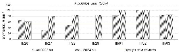 Улаанбаатар хотын агаарт түгээмэл бохирдуулах бодис хүхэрлэг хий /SO2/, азотын давхар исэл /NO2/, тоосонцор /PM10, PM2.5/, нүүрстөрөгчийн дутуу исэл /CO/, озон /O3/-ны агууламжийг тодорхойллоо.