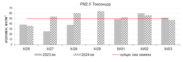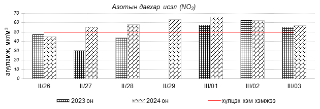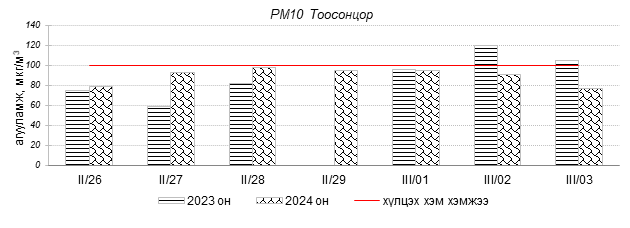 Улаанбаатар хотын агаарын чанарын индексийн мэдээгээр 2024 оны 02 дугаар сарын 26-аас 03 дугаар сарын 03-ны өдрүүдэд Зайсан, Толгойт, Нисэх, 13-р хороолол, Баруун 4-н зам, Налайх, 100-н айл, Амгалан, 5-н буудал, Ургах наран хороолол, Мишээл экспо, Хайлааст, Цахилгаан станц, Баянхошуу, Зурагт, 1-р хороолол, Дамбадаржаа, Шархад орчим “Бага бохирдолтой” түвшинд байсан байна. Дэлгэрэнгүйг эндээс үзнэ үү.