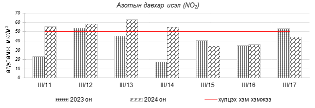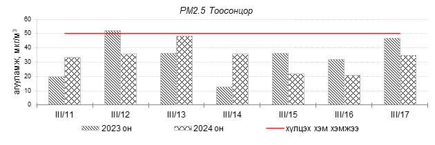Улаанбаатар хотын агаарын чанарын индексийн мэдээгээр 2024 оны 03 дугаар сарын 11-17-ны өдрүүдэд Мишээл экспо орчим “Цэвэр”, Зайсан, Толгойт, Нисэх, 13-р хороолол, Баруун 4-н зам, Налайх, 100-н айл, Амгалан, 5-н буудал, Ургах наран хороолол, Хайлааст, Зурагт, 1-р хороолол, Дамбадаржаа, Баянхошуу, Шархад орчим “Бага бохирдолтой” түвшинд байсан байна. Дэлгэрэнгүйг эндээс үзнэ үү.