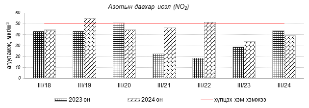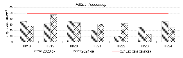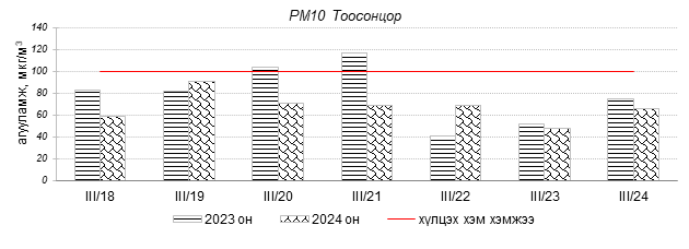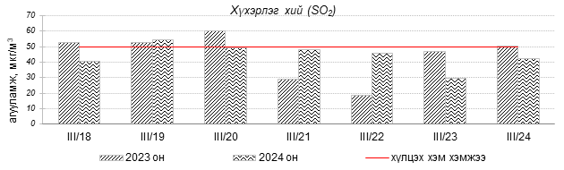Улаанбаатар хотын агаарын чанарын индексийн мэдээгээр 2024 оны 03 дугаар сарын 18-24-ний өдрүүдэд Зайсан, Мишээл экспо, Нисэх, орчим “Цэвэр”, 13-р хороолол орчим “Хэвийн”, Толгойт, Баруун 4-н зам, Налайх, 100-н айл, Амгалан, 5-н буудал, Ургах наран хороолол, Хайлааст, Зурагт, 1-р хороолол, Дамбадаржаа, Баянхошуу, Шархад орчим “Бага бохирдолтой” түвшинд байсан байна. Дэлгэрэнгүйг эндээс үзнэ үү.