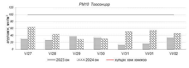 Улаанбаатар хотын агаарт түгээмэл бохирдуулах бодис хүхэрлэг хий /SO2/, азотын давхар исэл /NO2/, тоосонцор /PM10, PM2.5/, нүүрстөрөгчийн дутуу исэл /CO/, озон /O3/-ны агууламжийг тодорхойллоо.