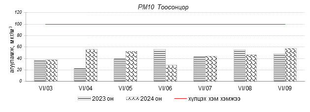 Улаанбаатар хотын агаарын чанарын индексийн мэдээгээр 2024 оны 06 дугаар сарын 03-09-ний өдрүүдэд Мишээл экспо, Шархад, Зайсан, 13-р хороолол, 100-н айл, Налайх, Амгалан, 1-р хороолол, Толгойт, Зурагт, Нисэх, Хайлааст, Ургах наран хороолол, Баянхошуу, Дамбадаржаа орчим “Цэвэр” болон “Хэвийн”, харин Баруун 4-н зам орчим “Бага бохирдолтой” түвшинд хүрсэн байна. Дэлгэрэнгүйг эндээс үзнэ үү.