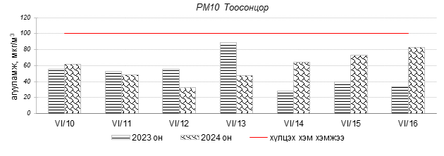 Улаанбаатар хотын агаарын чанарын индексийн мэдээгээр 2024 оны 06 дугаар сарын 10-16-ны өдрүүдэд Мишээл экспо, Шархад, Зайсан, Налайх, 1-р хороолол, Толгойт, Зурагт, Нисэх, Хайлааст, Баянхошуу, Дамбадаржаа орчим “Цэвэр” болон “Хэвийн”, харин 13-р хороолол, 100-н айл, Ургах наран хороолол, Амгалан, Баруун 4-н зам орчим “Бага бохирдолтой” түвшинд байсан байна. Дэлгэрэнгүйг эндээс үзнэ үү.