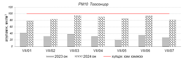 Улаанбаатар хотын агаарын чанарын индексийн мэдээгээр 2024 оны 07 дугаар сарын 01-07-ны өдрүүдэд Мишээл экспо, Толгойт, Зурагт, Нисэх, Баянхошуу, Дамбадаржаа орчим “Цэвэр” болон “Хэвийн”, харин зарим өдрүүдэд Шархад, Зайсан, Налайх, 1-р хороолол, Хайлааст, 13-р хороолол, 100-н айл, Ургах наран хороолол, Амгалан, Баруун 4-н зам орчим “Бага бохирдолтой” түвшинд хүрсэн байна. Дэлгэрэнгүйг эндээс үзнэ үү.