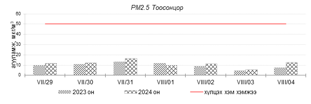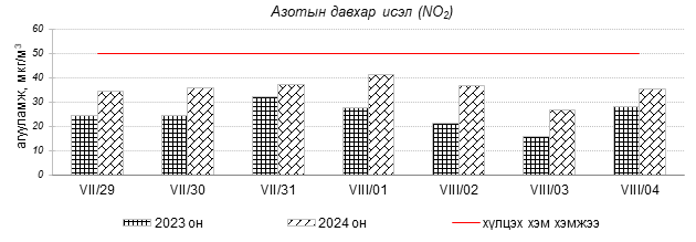 Улаанбаатар хотын агаарын чанарын индексийн мэдээгээр 2024 оны 07 дугаар сарын 29-өөс 08 дугаар сарын 04-ний өдрүүдэд Мишээл экспо, Толгойт, Зурагт, Нисэх, Дамбадаржаа, Шархад, Налайх, 1-р хороолол, Хайлааст, 13-р хороолол, 100-н айл, Ургах наран хороолол орчим “Цэвэр” болон “Хэвийн”, Зайсан, Баруун 4-н зам орчим “Бага бохирдолтой” түвшинд хүрсэн байна. Дэлгэрэнгүйг эндээс үзнэ үү.