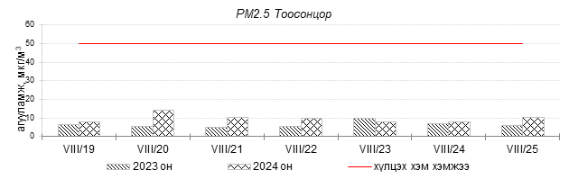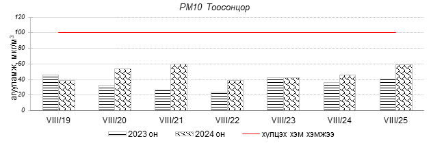 Улаанбаатар хотын агаарын чанарын индексийн мэдээгээр 2024 оны 08 дугаар сарын 19-25-ны өдрүүдэд Мишээл экспо, Шархад, Налайх, 13-р хороолол, 1-р хороолол, Ургах наран хороолол, Толгойт, Зурагт, 5-н буудал, Нисэх, Хайлааст, Баянхошуу, Дамбадаржаа орчим “Цэвэр” болон “Хэвийн”, харин 100-н айл, Зайсан, Баруун 4-н зам орчим “Бохирдолтой” түвшинд хүрсэн байна. Дэлгэрэнгүйг эндээс үзнэ үү.