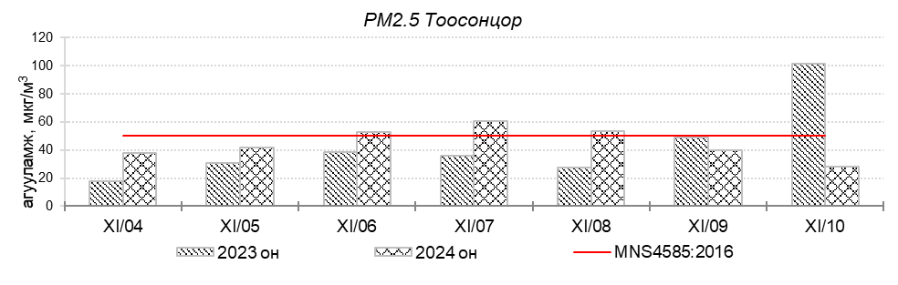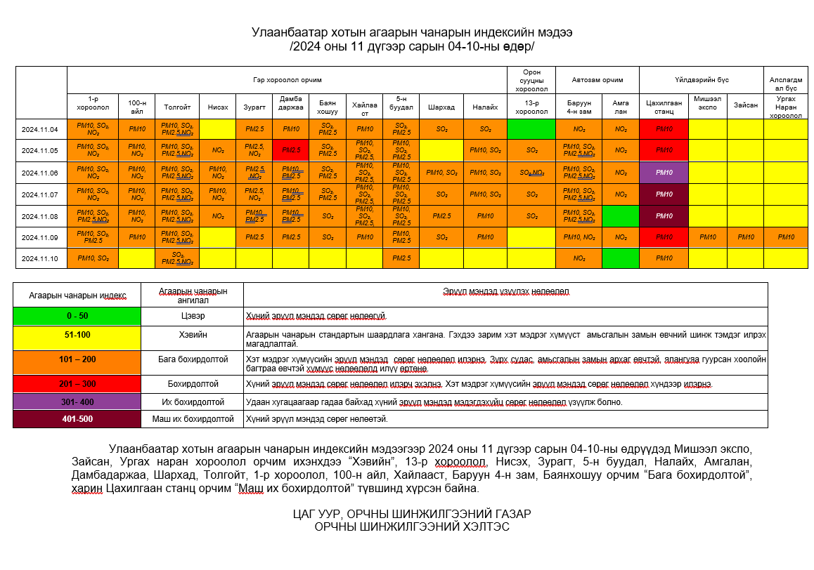 Улаанбаатар хотын агаарт түгээмэл бохирдуулах бодис хүхэрлэг хий /SO2/, азотын давхар исэл /NO2/, тоосонцор /PM10, PM2.5/, нүүрстөрөгчийн дутуу исэл /CO/, озон /O3/-ны агууламжийг тодорхойллоо.