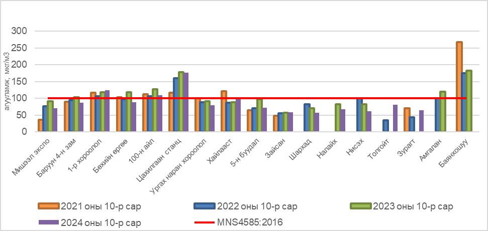 2024 оны 10 дугаар сард Азотын давхар исэл (NO2) -ийн дундаж агууламжийг агаарын чанарын хяналт шинжилгээний харуул тус бүрээр авч үзвэл Баруун 4-н зам 107 мкг/м3-ээр, Толгойт 2 мкг/м3-ээр агаарын чанарын стандарт MNS 4585:2016 дахь хүлцэх агууламжаас тус тус их байна (Зураг 4).