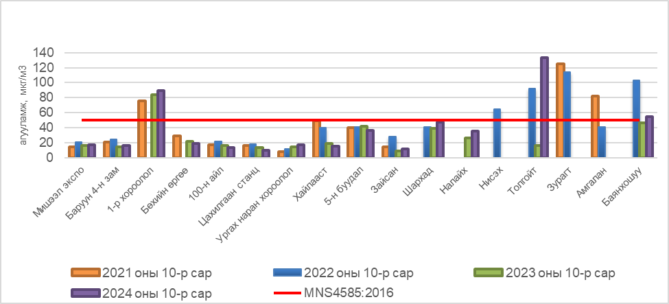 2024 оны 10 дугаар сард РМ10 тоосонцрын дундаж агууламжийг агаарын чанарын хяналт шинжилгээний харуул тус бүрээр авч үзвэл 1-р хороолол 24 мкг/м3-ээр, 100-н айл 9 мкг/м3-ээр, Цахилгаан станц 77 мкг/м3-ээр, Хайлааст 3 мкг/м3-ээр агаарын чанарын стандарт MNS 4585:2016 дахь хүлцэх агууламжаас тус тус их байна (Зураг 3).