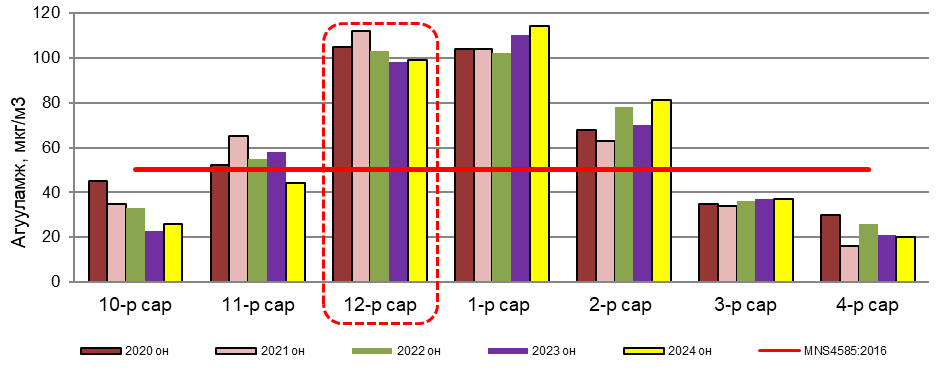 Улаанбаатар хотын агаар дахь PM10 тоосонцрын 2024 оны 12 дугаар сарын дундаж агууламжийг өмнөх оны мөн үе буюу 2023 оны 12 дугаар сарын дундаж агууламжтай харьцуулахад 15 мкг/м3-ээр буюу 13%-иар их. Агаарын чанарын стандарт MNS 4585:2016 дахь хүлцэх агууламжаас 31 мкг/м3-ээр их байна (Зураг 4).