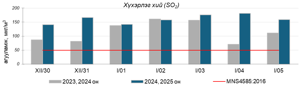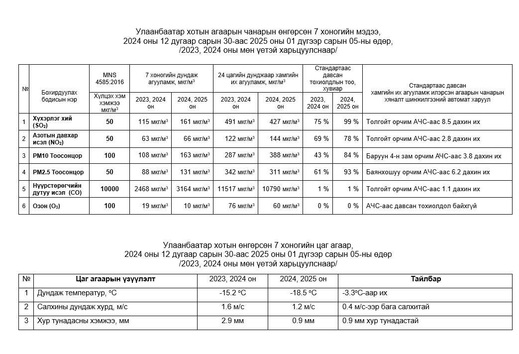 Улаанбаатар хотын агаарт түгээмэл бохирдуулах бодис хүхэрлэг хий /SO2/, азотын давхар исэл /NO2/, тоосонцор /PM10, PM2.5/, нүүрстөрөгчийн дутуу исэл /CO/, озон /O3/-ны агууламжийг тодорхойллоо.