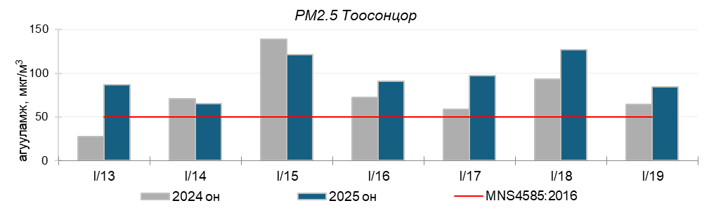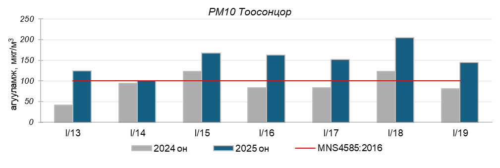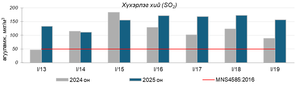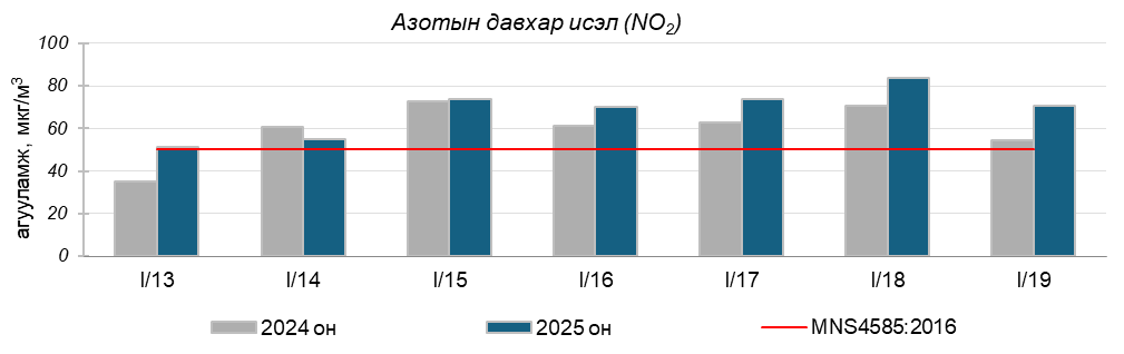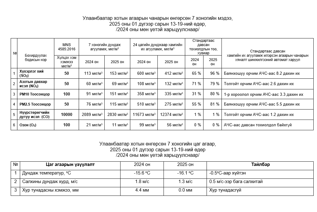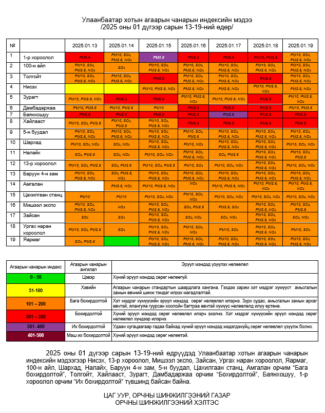 Улаанбаатар хотын агаарт түгээмэл бохирдуулах бодис хүхэрлэг хий /SO2/, азотын давхар исэл /NO2/, тоосонцор /PM10, PM2.5/, нүүрстөрөгчийн дутуу исэл /CO/, озон /O3/-ны агууламжийг тодорхойллоо.