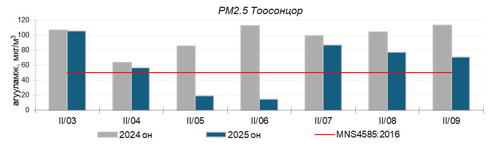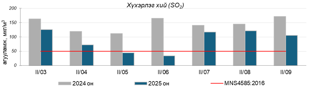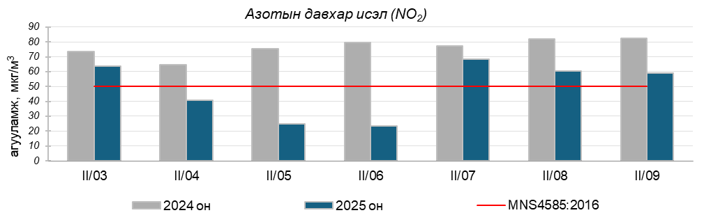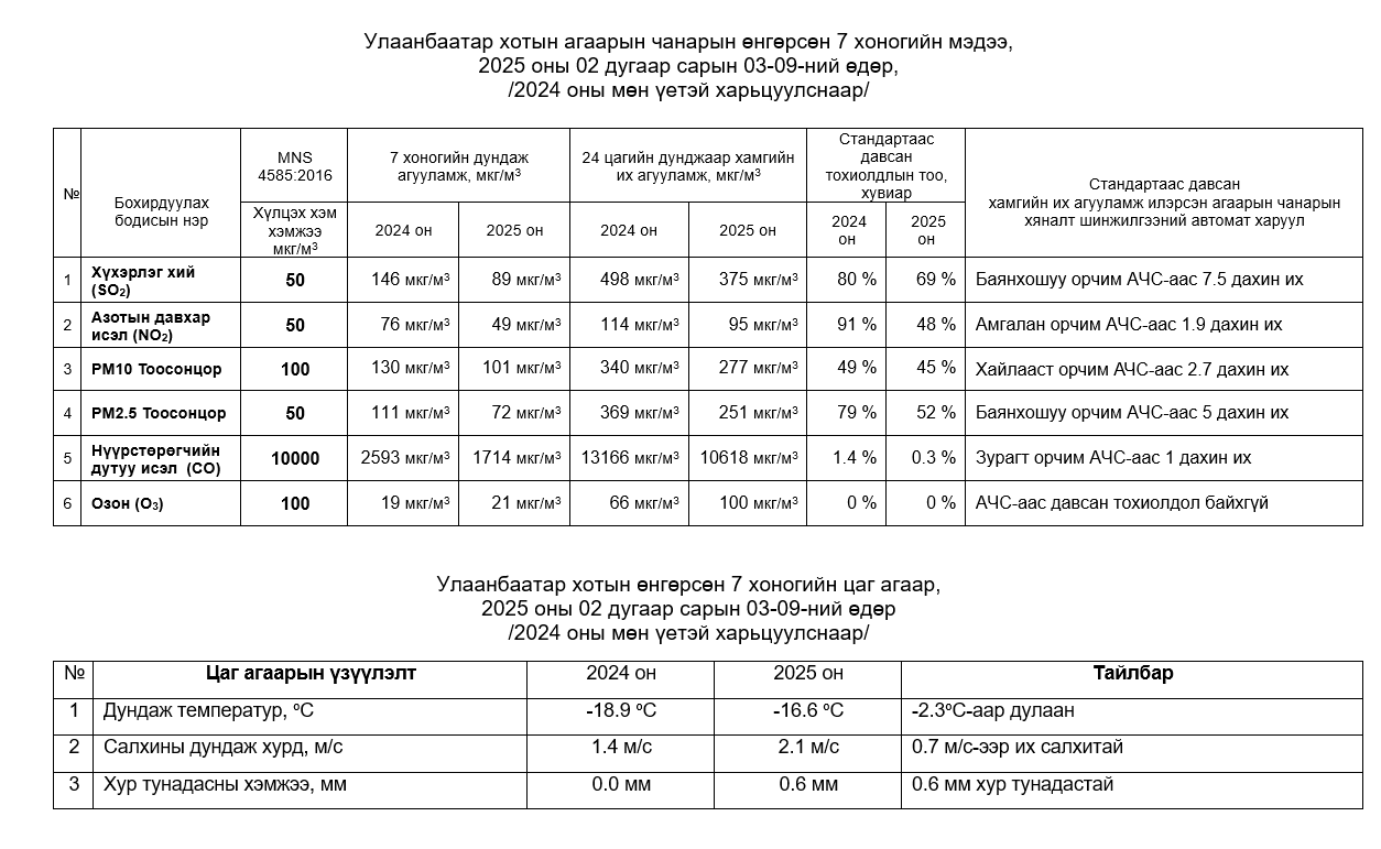 Улаанбаатар хотын агаарт түгээмэл бохирдуулах бодис хүхэрлэг хий /SO2/, азотын давхар исэл /NO2/, тоосонцор /PM10, PM2.5/, нүүрстөрөгчийн дутуу исэл /CO/, озон /O3/-ны агууламжийг тодорхойллоо.