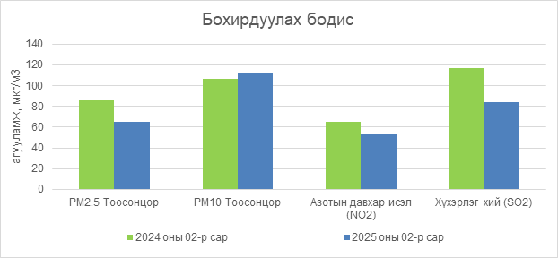 Улаанбаатар хотын агаар бохирдуулах бодисын 2025 оны 02 дугаар сарын дундаж агууламжийг өмнөх оны мөн үе 2024 оны 02 дугаар сарын дундаж агууламжтай харьцуулахад азотын давхар исэл (NO2) нь 12 мкг/м3-ээр буюу 18%-иар, хүхэрлэг хий (SO2) нь 33 мкг/м3-ээр буюу 28%-иар, PM2.5 тоосонцор 21 мкг/м3-ээр буюу 24%-иар тус тус бага, харин PM10 тоосонцор 6 мкг/м3-ээр буюу 6%-иар их байна.