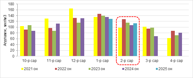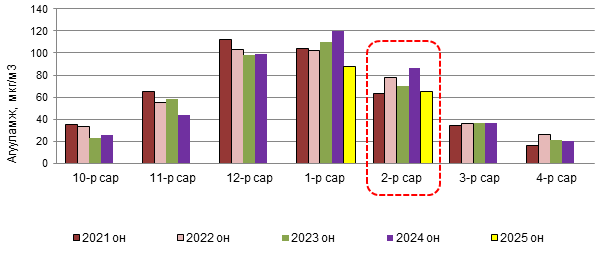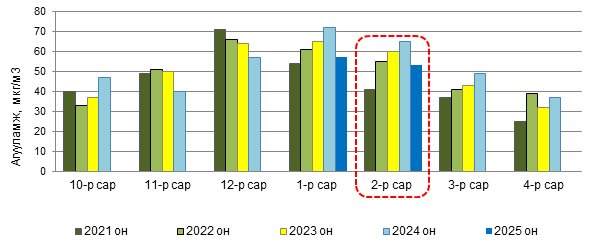 Азотын давхар ислийн (NO2) 2025 оны 02 дугаар сарын дундаж агууламж 2021 оны 02 дугаар сараас 12 мкг/м3-ээр буюу 29 %-иар их. Харин 2022, 2023 оны 02 дугаар сарын дундаж агууламжтай харьцуулахад 2-7 мкг/м3-ээр буюу 4-12 %-иар бага, 2024 оны 02 дугаар сарын дундаж агууламжтай харьцуулахад 12 мкг/м3-ээр буюу 18%-иар бага байна (Зураг 6).