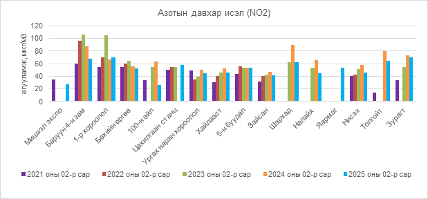 2025 оны 02 дугаар сарын Азотын давхар исэл (NO2)-ийн дундаж агууламж Мишээл экспо 27 мкг/м3, Цахилгаан станц 58 мкг/м3, Яармаг 54 мкг/м3 байна. 2024 оны 02 дугаар сартай харьцуулахад Баруун 4-н зам АЧС-аас 20 мкг/м3-ээр, Бөхийн өргөө 3 мкг/м3-ээр, 100-н айл 37 мкг/м3-ээр, Ургах наран хороолол 5 мкг/м3-ээр, Хайлааст 7 мкг/м3-ээр, Зайсан 5 мкг/м3-ээр, Шархад 28 мкг/м3-ээр, Налайх 21 мкг/м3-ээр, Нисэх 12 мкг/м3-ээр, Толгойт 25 мкг/м3-ээр , Зурагт 3 мкг/м3-ээр тус тус бага, 5-н буудал ижил түвшинд, харин 1-р хороолол 3 мкг/м3-ээр их байна (Зураг 7).