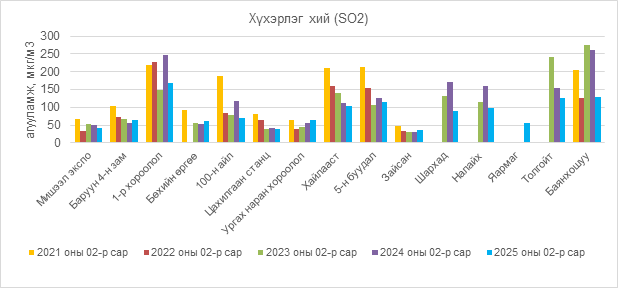 Агаар дахь хүхэрлэг хийн (SO2) 2025 оны 02 дугаар сарын дундаж агууламжийг 2021-2023 оны 02 дугаар сарын дундаж агууламжтай харьцуулахад 27-55 мкг/м3-ээр буюу 24-39 %-иар бага, өмнөх оны мөн үе буюу 2024 оны 02 дугаар сарын дундаж агууламжтай харьцуулахад 33 мкг/м3-ээр буюу 28%-иар бага байна (Зураг 8).