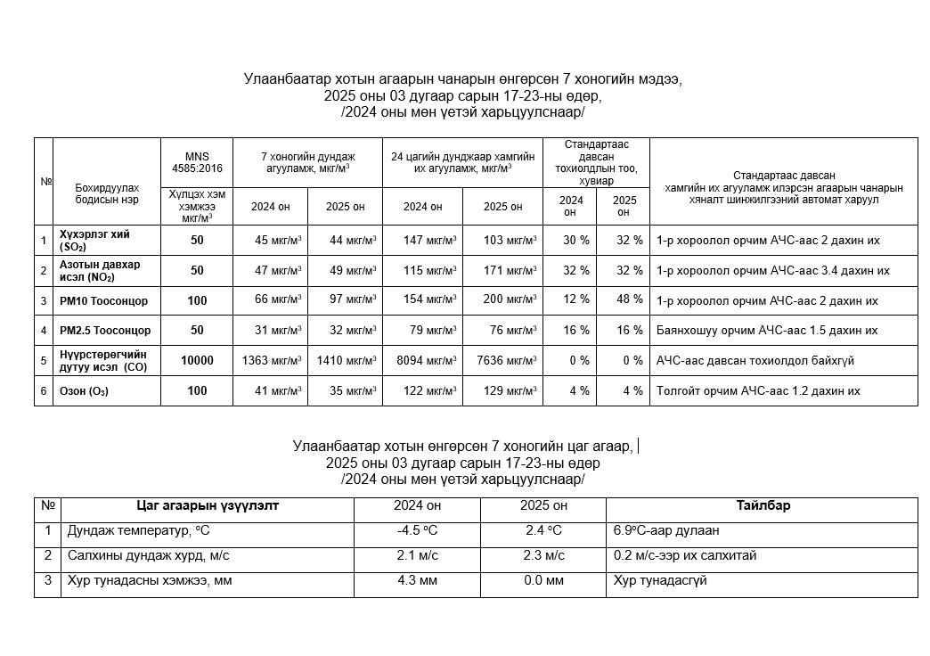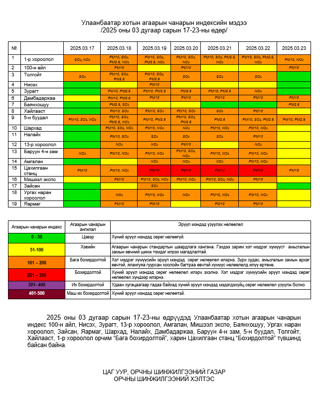 Улаанбаатар хотын агаарын чанарын 7 хоногийн мэдээ /2025.03.17-2025.03.23/
