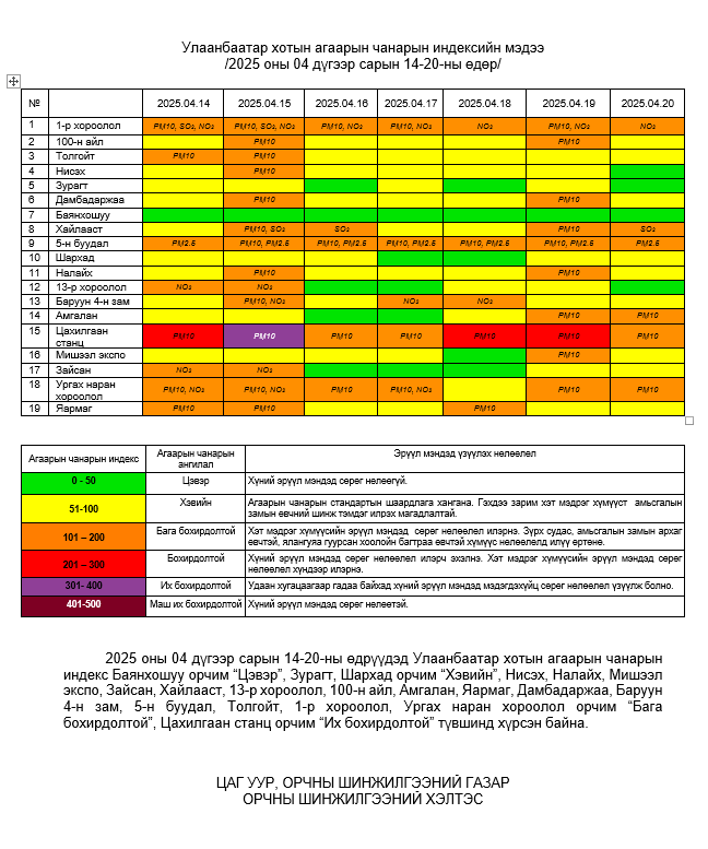 Улаанбаатар хотын агаарт түгээмэл бохирдуулах бодис хүхэрлэг хий /SO2/, азотын давхар исэл /NO2/, тоосонцор /PM10, PM2.5/, нүүрстөрөгчийн дутуу исэл /CO/, озон /O3/-ны агууламжийг тодорхойллоо.