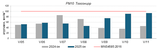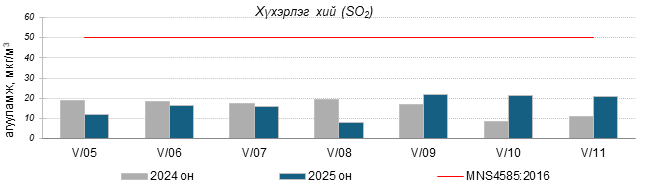 Улаанбаатар хотын агаарт түгээмэл бохирдуулах бодис хүхэрлэг хий /SO2/, азотын давхар исэл /NO2/, тоосонцор /PM10, PM2.5/, нүүрстөрөгчийн дутуу исэл /CO/, озон /O3/-ны агууламжийг тодорхойллоо.