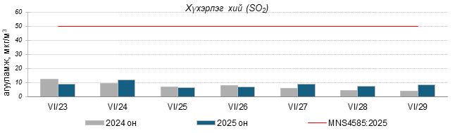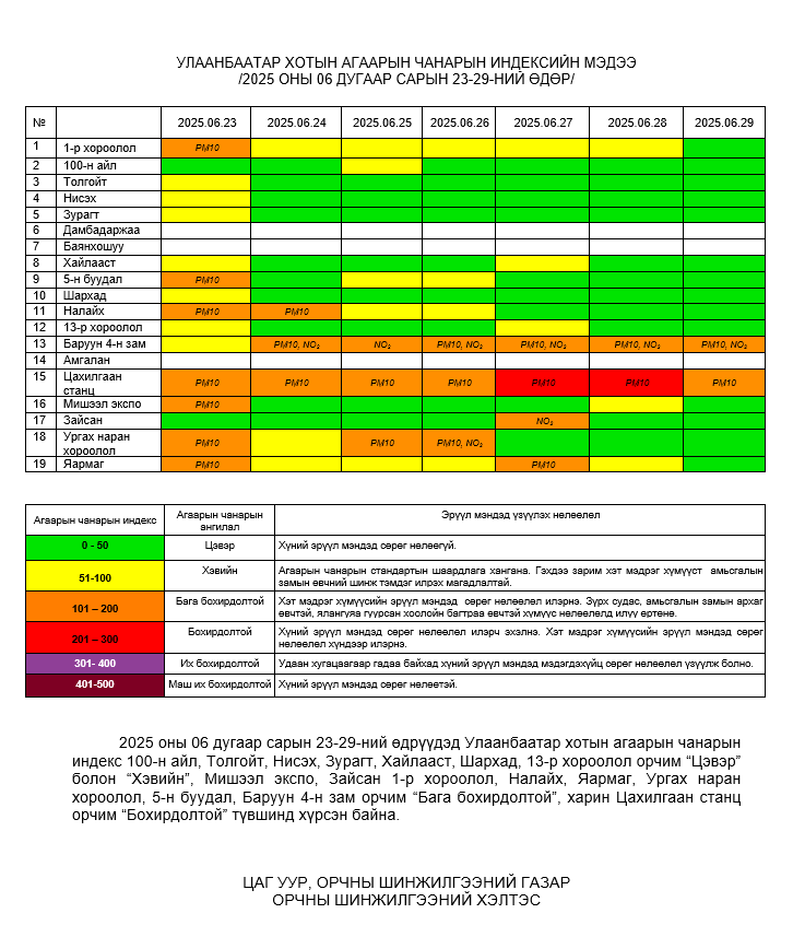 Улаанбаатар хотын агаарт түгээмэл бохирдуулах бодис хүхэрлэг хий /SO2/, азотын давхар исэл /NO2/, тоосонцор /PM10, PM2.5/, нүүрстөрөгчийн дутуу исэл /CO/, озон /O3/-ны агууламжийг тодорхойллоо.
