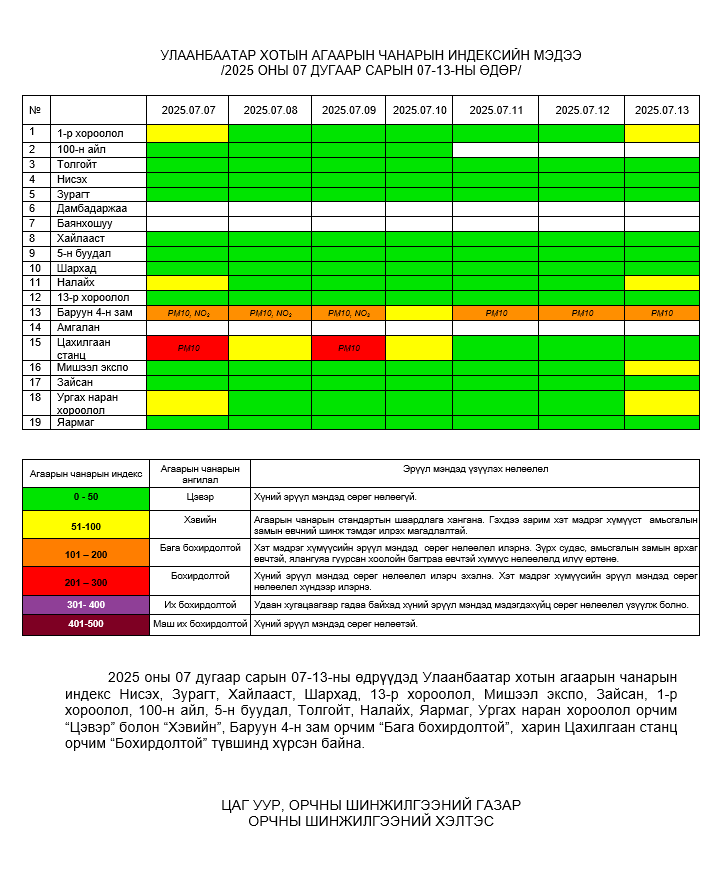 Улаанбаатар хотын агаарт түгээмэл бохирдуулах бодис хүхэрлэг хий /SO2/, азотын давхар исэл /NO2/, тоосонцор /PM10, PM2.5/, нүүрстөрөгчийн дутуу исэл /CO/, озон /O3/-ны агууламжийг тодорхойллоо.