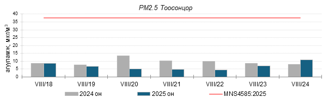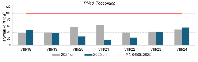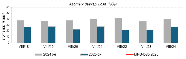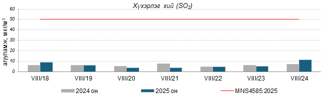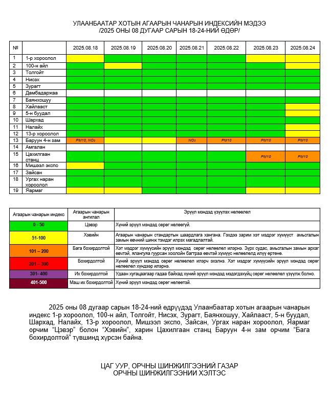 Улаанбаатар хотын агаарт түгээмэл бохирдуулах бодис хүхэрлэг хий /SO2/, азотын давхар исэл /NO2/, тоосонцор /PM10, PM2.5/, нүүрстөрөгчийн дутуу исэл /CO/, озон /O3/-ны агууламжийг тодорхойллоо.