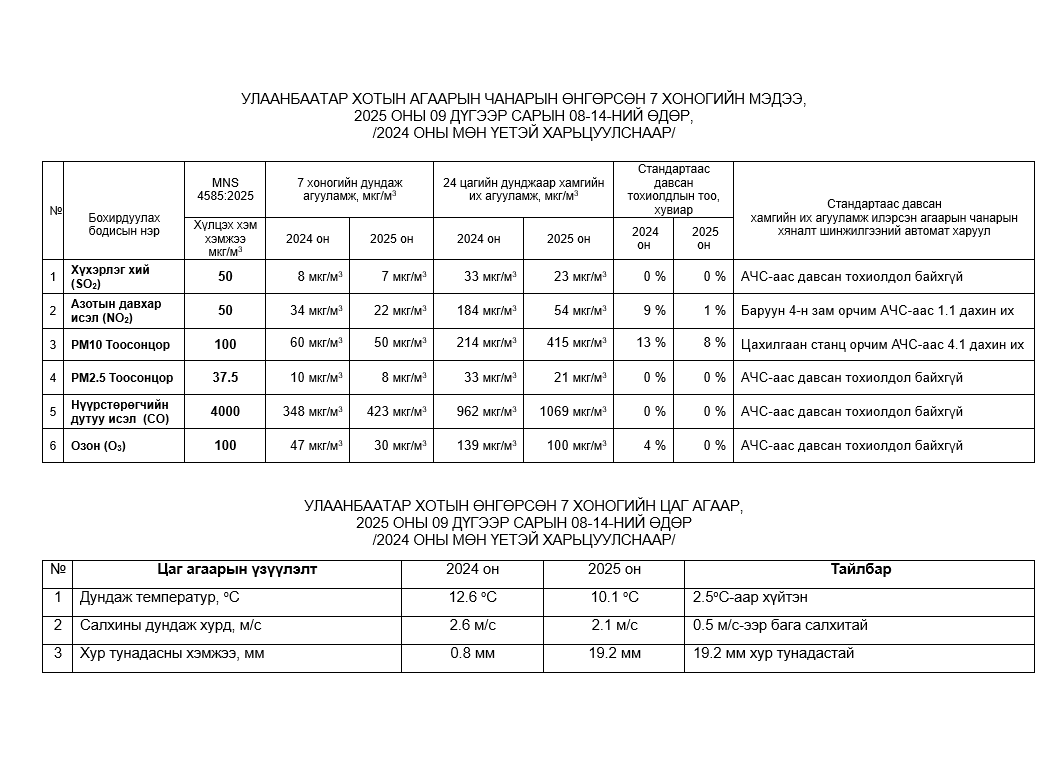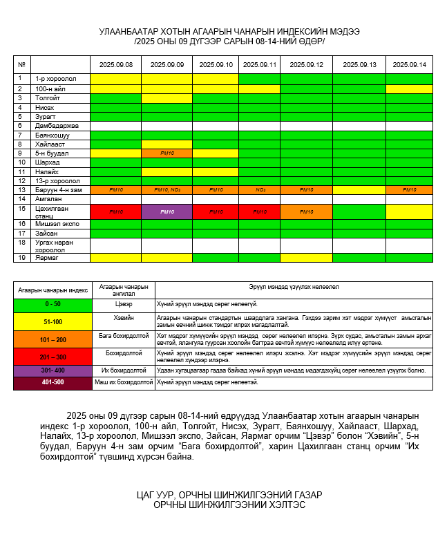 Улаанбаатар хотын агаарын чанарын 7 хоногийн мэдээ /2025.09.08-2025.09.14/