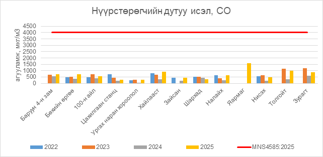 2025 оны 09 дүгээр сарын 29-ний байдлаар нүүрстөрөгчийн дутуу исэл (СО) нь бүх цэгүүдэд MNS 4585:2025 АЧС-аас даваагүй байна.