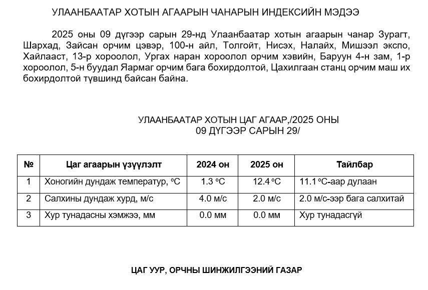 2025 оны 09 дүгээр сарын 29-ний байдлаар РМ2.5 тоосонцор Цахилгаан станц орчим АЧС-аас 35.5 мкг/м3 –ээр их, Яармаг орчим АЧС-аас 8.5 мкг/м3 –ээр их, бусад цэгүүдэд MNS 4585:2025 АЧС-аас даваагүй байна.