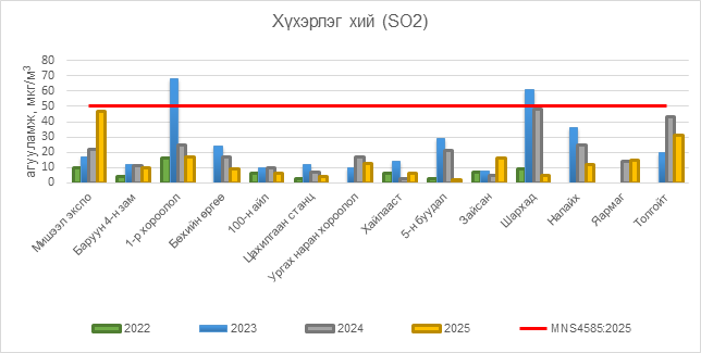 2025 оны 10 дугаар сарын 01-ний байдлаар хүхэрлэг хий (SO2) нь бүх цэгүүдэд MNS 4585:2025 АЧС-аас даваагүй байна.