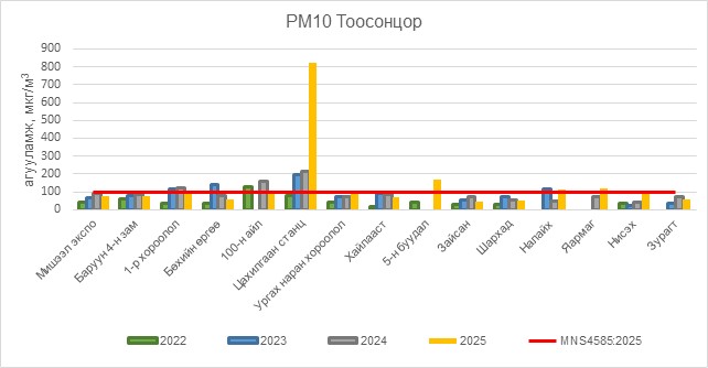 2025 оны 10 дугаар сарын 01-ний байдлаар РМ10 тоосонцор нь 1-р хороолол орчим АЧС-аас 5 мкг/м3 –ээр их, Цахилгаан станц орчим АЧС-аас 724 мкг/м3 –ээр их, 5-н буудал орчим АЧС-аас 70 мкг/м3 –ээр их, Налайх орчим АЧС-аас 12 мкг/м3 –ээр их, Яармаг орчим АЧС-аас 19 мкг/м3 –ээр их, бусад цэгүүдэд MNS 4585:2025 АЧС-аас даваагүй байна.
