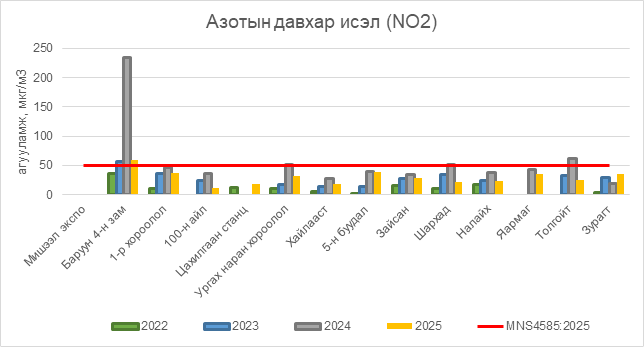 2025 оны 10 дугаар сарын 02-ны байдлаар азотын давхар исэл (NO2) нь Баруун 4-н зам орчим АЧС-аас 10 мкг/м3 –ээр их, бусад цэгүүдэд MNS 4585:2025 АЧС-аас даваагүй байна.