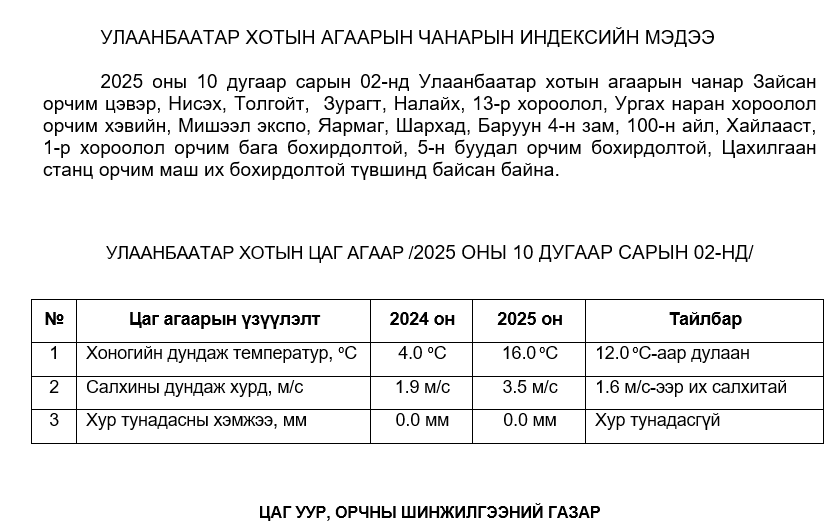 2025 оны 10 дугаар сарын 02-ны байдлаар РМ10 тоосонцор нь Мишээл экспо орчим АЧС-аас 8 мкг/м3 –ээр их, Баруун 4-н зам орчим АЧС-аас 11 мкг/м3 –ээр их, 1-р хороолол орчим АЧС-аас 47 мкг/м3 –ээр их, 100-н айл орчим АЧС-аас 24 мкг/м3 –ээр их, Цахилгаан станц орчим АЧС-аас 750 мкг/м3 –ээр их, Хайлааст орчим АЧС-аас 19 мкг/м3 –ээр их, 5-н буудал орчим АЧС-аас 290 мкг/м3 –ээр их, Налайх орчим АЧС-аас 8 мкг/м3 –ээр их, Яармаг орчим АЧС-аас 83 мкг/м3 –ээр их, бусад цэгүүдэд MNS 4585:2025 АЧС-аас даваагүй байна.