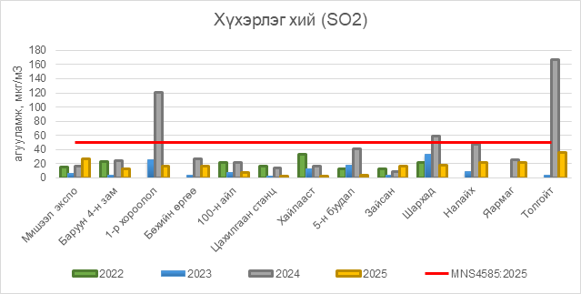 2025 оны 10 дугаар сарын 07-ны байдлаар хүхэрлэг хий (SO2) нь бүх цэгүүдэд MNS 4585:2025 АЧС-аас даваагүй байна.