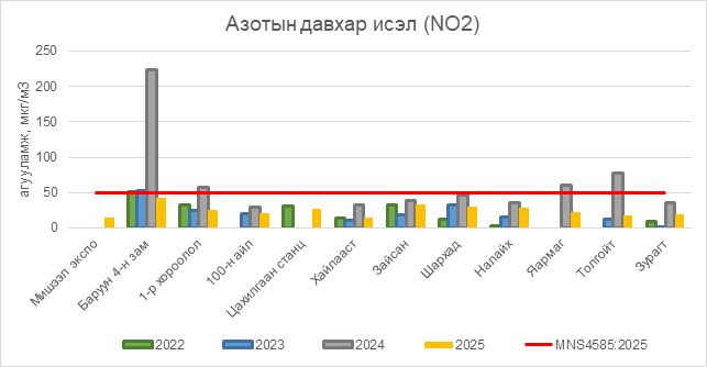 2025 оны 10 дугаар сарын 07-ны байдлаар азотын давхар исэл (NO2) нь бүх цэгүүдэд MNS 4585:2025 АЧС-аас даваагүй байна.