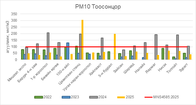 2025 оны 10 дугаар сарын 07-ны байдлаар РМ10 тоосонцор нь Цахилгаан станц орчим АЧС-аас 204 мкг/м3 –ээр их, 5-н буудал орчим АЧС-аас 97 мкг/м3 –ээр их, бусад цэгүүдэд MNS 4585:2025 АЧС-аас даваагүй байна.