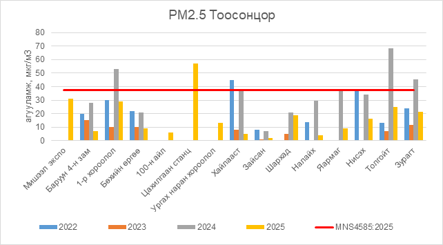 2025 оны 10 дугаар сарын 07-ны байдлаар РМ2.5 тоосонцор нь Цахилгаан станц орчим АЧС-аас 19.5 мкг/м3 –ээр их, бусад цэгүүдэд MNS 4585:2025 АЧС-аас даваагүй байна.