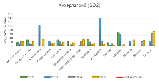 2025 оны 10 дугаар сарын 09-ний байдлаар хүхэрлэг хий (SO2) нь Толгойт орчим АЧС-аас 24 мкг/м3 –ээр их, бусад цэгүүдэд MNS 4585:2025 АЧС-аас даваагүй байна.