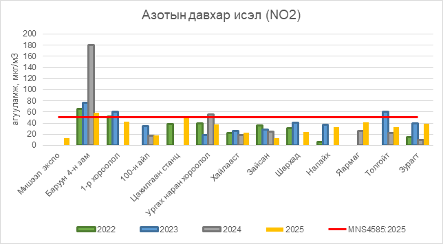 2025 оны 10 дугаар сарын 09-ний байдлаар азотын давхар исэл (NO2) нь Баруун 4-н зам орчим АЧС-аас 9 мкг/м3 –ээр их, бусад цэгүүдэд MNS 4585:2025 АЧС-аас даваагүй байна.